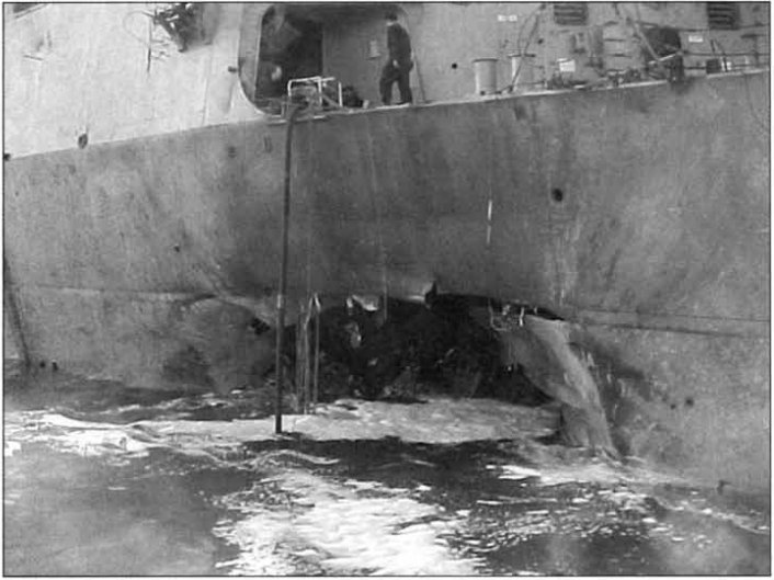 Повреждения американского судна «Коул» после бомбардировки в Адене 12 октября 2000 года. © Reuters/CORBIS.