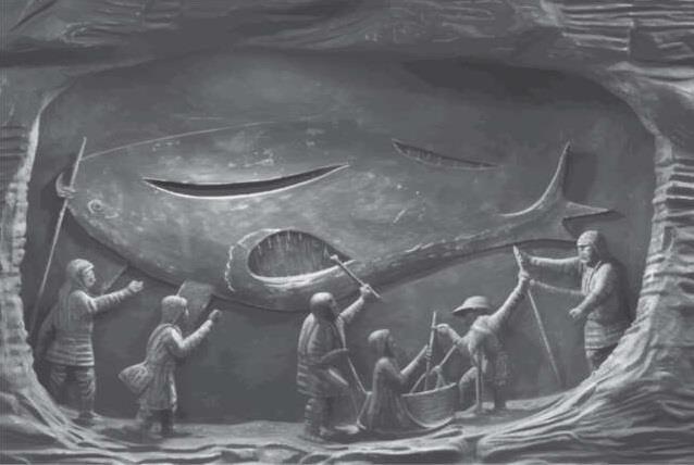 Следующая ниша была более мрачной, на рисунке было убийство еще одного гренландского кита. Казалось, люди извлекали из китообразного что-то жизненно важное. Изображение было более грубым, как будто художнику было стыдно за то, что он был вынужден изображать.