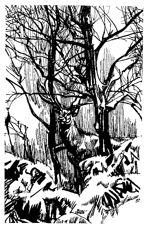 Проваливаясь по колено в снег, мы сбежали по склону долины и вошли в лес. Здесь снег был не такой глубокий, но ветви сосен гнулись под тяжестью снежного покрова. Мы набрели на следы оленя и лося, вскоре увидели красивого белохвостого оленя, с любопытством на нас смотревшего. Олень был такой большой и жирный, что я снова почувствовал голод и жалобно протянул: