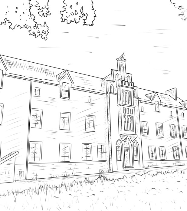 [Закрыть]. За ограждением из булыжника виднелось строгое двухэтажное здание с необычной, почти плоской крышей с уклоном 8 градусов, с черными оконными рамами интересной формы, характерной для старинной немецкой архитектуры. Постройка выглядела стильно и благородно. Двор был вымощен брусчаткой, вдоль забора высажены цветы.