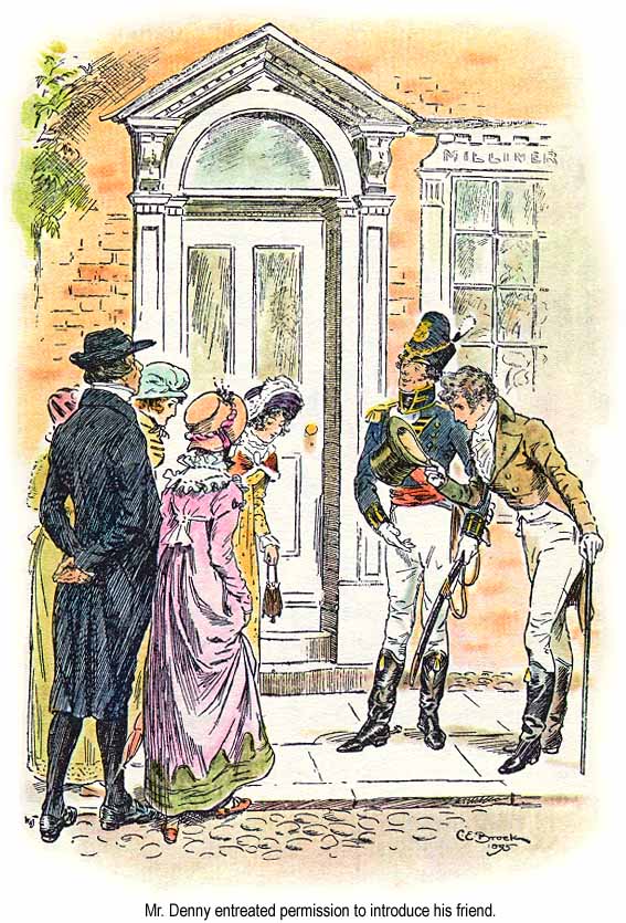 Мистер Денни и мистер Уикхем проводили молодых леди до дома мистера Филипса и здесь раскланялись с ними, несмотря на настойчивые приглашения Лидии зайти в дом, поддержанные громкими восклицаниями высунувшейся из окна миссис Филипс.