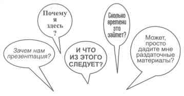 Вы заинтересованы в происходящем. В конце концов, вы потратили дни, недели, может быть, месяцы на этот проект, не спали ночами, составляя и репетируя презентацию. Заинтересованы ли в происходящем слушатели? Если да, прекрасно! Вы сможете сразу перейти к изложению материала. Если нет, вы должны как можно быстрее переключить их интерес на происходящее в аудитории со всего того, что ожидает их за ее пределами: электронной почты, сообщений на автоответчике и т. д.