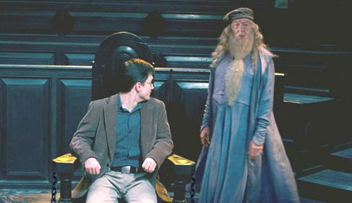 На Дамблдоре, который неспешно шел через зал, была длинная синяя мантия, и лицо его выражало непоколебимое спокойствие. Седина волос и длинной бороды серебрилась в свете факелов. Поравнявшись с Гарри, он посмотрел на Фаджа сквозь полукружья очков, сидевших на середине крючковатого носа.