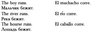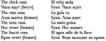 В следующем примере сопоставляются английский глагол to run ('бежать') и испанский эквивалент cone. Мы можем выделить четыре различных соотношения между данными эквивалентами, которые типичны для межъязыкового сопоставления лексических систем и других языков.