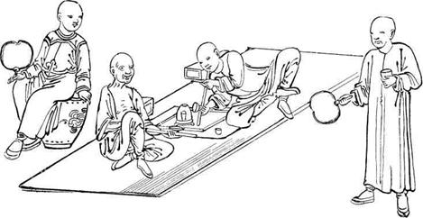 В день Нового года гражданские и военные чиновники всех рангов отправляются с визитом поздравить генерал-губернатора провинции, где служат. В Пекине князья и высокопоставленные вельможи являются в императорский дворец поклониться императору. Он, сидя на драконьем троне, принимает их учтивее, чем всегда. Согласно букве закона на приеме должны присутствовать все государственные служащие империи. Поскольку это невыполнимо, в четыре часа утра они направляются в храмы Вэньчан-гуань (или императорские храмы), которые есть в каждом укрепленном городе. В каждом императорском храме находится точная копия – модель пекинского драконьего трона. К нему ведут девять ступеней. На троне помещена табличка {67} с надписью следующего содержания: «Пусть царствующий государь будет править страной десять тысяч лет и еще десять раз по десять тысяч лет». В знак почтения мандарины совершают коутоу на значительном расстоянии от трона. В 1861 году эту церемонию с большой помпой провели в Кантоне. Мандарины облачились в придворное платье, которое не носили с 1857 года, потому что шла война с Англией и Францией, а закон запрещает чиновникам ходить при полном параде во время войны с другими странами. По завершении церемонии мандарины снимают с одежды аксессуары, обязательные в присутствии императора, и отправляются на молитвы в храмы Конфуция, Вэньчана и Гуань-ди.
