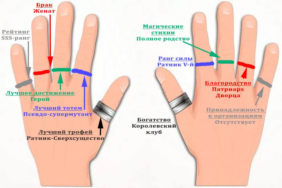 Правый мизинец [Принадлежность к серьезным организациям] Речь о Гильдии Авантюристов, Ассоциации Охотников, королевском происхождении (лорды земель Титардо), Институте (ученые, исследователи, археологи), Академии Магии, Небесном Магистрате, посту в Мировом Правительстве и других. В общем, в Титардо на правый мизинец смотрят очень внимательно.