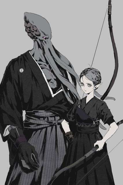 Промчавшись вокруг меня на полной скорости, эльфийка остановилась рядом. Необычное чёрное кимоно и рост девчушки-коротышки сильно контрастировали с суровым взглядом. Зависнув в воде, я ей языком жестов показал: