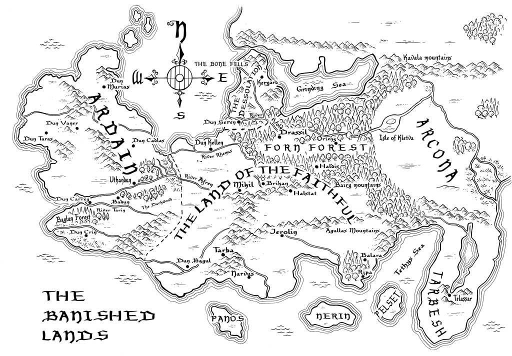 Дрему было все равно, как он называется; он просто знал, что любит его, что он чувствует себя его частью, его постоянным спутником. Костяная рукоять была изношена до идеального соответствия кулаку Дрема. Он разделил трапезу между ними, и они сидели и ели в дружеском молчании. Они находились в предгорьях, которые вели к заснеженным горам у них за спиной, но Дрем смотрел в противоположную сторону, на раскинувшийся под ними пейзаж. Над ними возвышалось огромное озеро, воды которого темнели и переливались в лучах заходящего солнца, а вокруг него простирались деревья и луга, окрашенные в красные и золотые тона, когда осень переходила в зиму. Между Дремом и озером мерцали огни большого города, крошечные, как светлячки на таком расстоянии. Крепкая крепостная стена окружала город, усеянный огнями факелов. Это был Кергард, самый северный город Запустения, построенный суровыми людьми для выживания в тяжелых условиях. Дрему нравилось, как все это выглядит: цвета сливались, огни светились мягко и тепло, как свечи. За стенами острога вспыхивали другие огни – разбросанные по земле усадьбы. Дрем отыскал глазами свой собственный дом, расположенный немного севернее, среди лесных зарослей, но он знал, что там не будет ни костров, ни факелов, ни свечей, горящих у окна.
