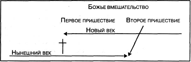 С Первым пришествием Христа новый век вторгся в прежний или «наложился» на него. Оба века будут существовать параллельно вплоть до Второго пришествия, когда прежний будет окончательно уничтожен. Следовательно, христиане одновременно живут в двух мирах.