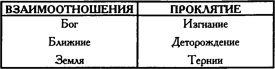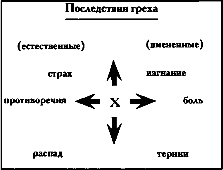 Эта схема очень похожа не предыдущую; в этом ее варианте показано, что грех влечет за собой два типа последствий: естественные и вмененные. Когда наши взаимоотношения с Богом нарушаются, у нас естественным образом возникает страх – мы начинаем Его бояться. А когда нарушаются наши взаимоотношения с ближними, естественным следствием этого становятся разногласия, ссоры и насилие. Разрыв отношений Адама с землей имел естественным следствием распад и увядание.