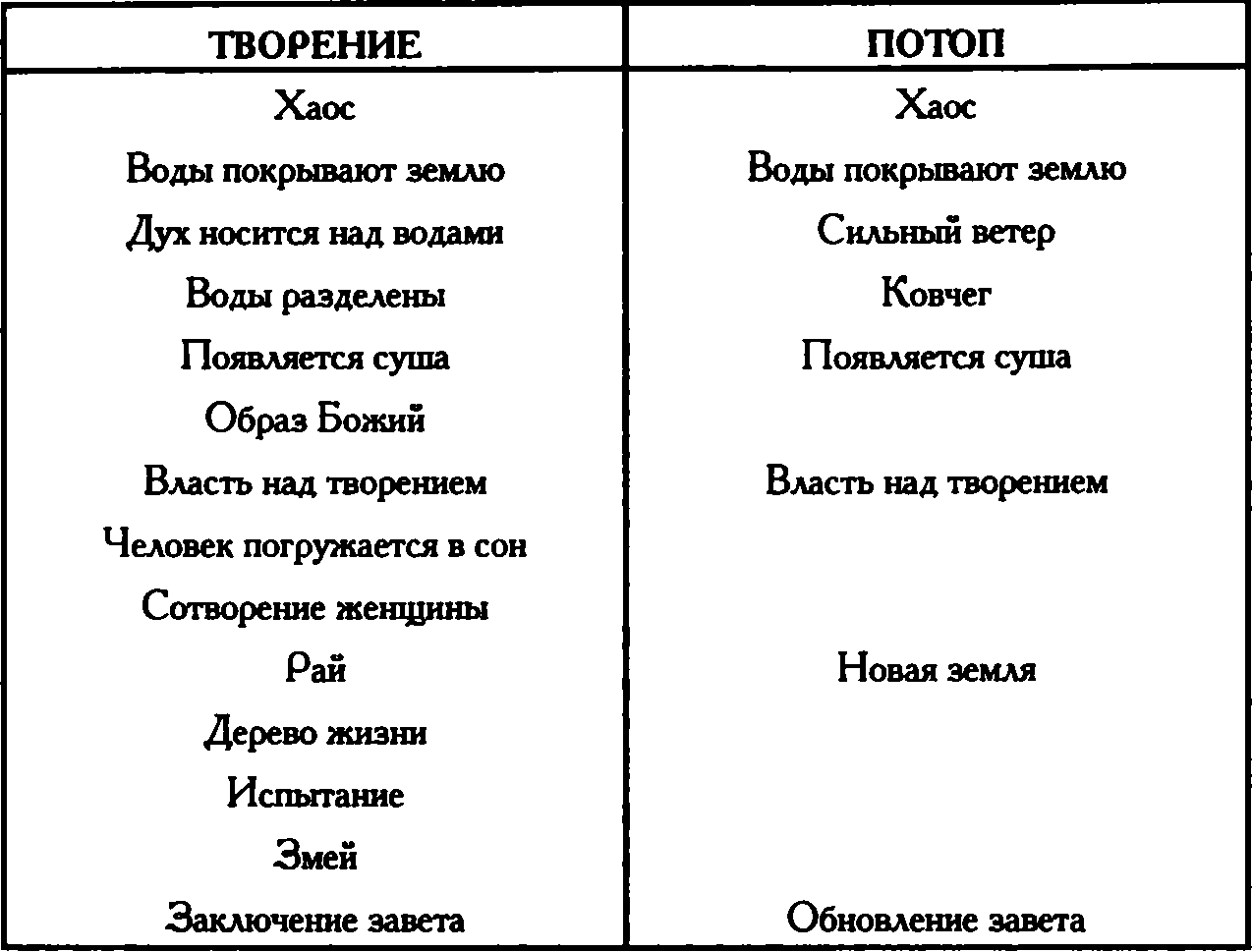 Как мы уже увидели, Священное Писание намеренно описывает губительные последствия потопа языком, напоминающим о сотворении. Шаги, предпринятые Богом при сотворении в Быт. 1 и 2, Он как бы обращает вспять. Он разбирает Свое творение в Быт. 6 и 7, а затем собирает его снова в Быт. 8 и 9. Бог следует четкому и устойчивому замыслу или образцу, повторяя то, что уже делал раньше. С другой стороны, этот образец не служит для Него точным руководством к действию, а остается таковым только в общих чертах.