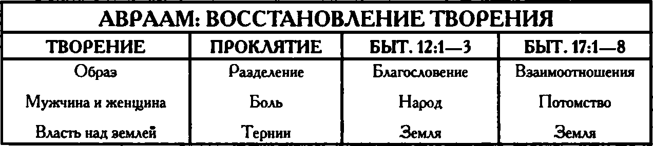 Почему Бог дает Аврааму это тройное обетование? Давайте вернемся на мгновение в самое начало. Рассматривая рассказ о творении, мы отметили, что образ Божий включал в себя три вектора взаимоотношений Адама и Евы: с Богом, друг с другом и с землей. Таким образом, проклятие, которое они на себя навлекли, сказалось более всего на этих трех векторах взаимоотношений: результатом разрыва взаимоотношений между Адамом и Богом стало изгнание из райского сада; боль при деторождении стала существенным фактором в распространении рода человеческого и человеческих взаимоотношениях; а тернии (сорняки) сильно осложнили взаимоотношения между Адамом и землей. Так что тройное проклятие, произнесенное в Едемском саду, вполне соответствует трем векторам взаимоотношений, составлявшим образ Божий, который получили Адам и Ева при творении.