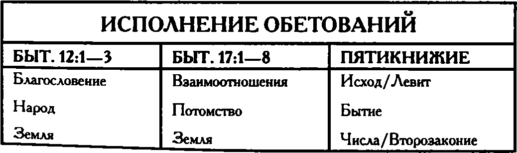 Четыре книги, следующие за Книгой Бытие – Исход, Левит, Числа и Второзаконие, все описывают Исход. Эти повествования строятся на обетованиях, данных Аврааму в Быт. 12 и 17. Они показывают, как эти обетования исполняются в ходе истории. Таким образом, Быт. 12:1—3 – это своего рода стержень всего Пятикнижия. Этот ключевой текст обращается сначала к первобытной истории, к проклятию и восстановлению Едемского сада. А затем обетования, которые дал Бог Аврааму, создают фон, на котором разворачиваются все последующие события. Книга Бытие сосредоточена, в частности, на приумножении еврейского народа. (Современные люди озабочены перенаселенностью мира, им трудно понять, каким хрупким и ненадежным было человеческое существование в древние времена.) В центре внимания книг Исход и Левит находится прежде всего обетование об обновленных отношениях с Богом. Числа и Второзаконие сосредоточены на обетовании земли. Таким образом, Пятикнижие представляет собой собрание книг, призванное показать теологическое основание взаимоотношений Бога с Израилем.