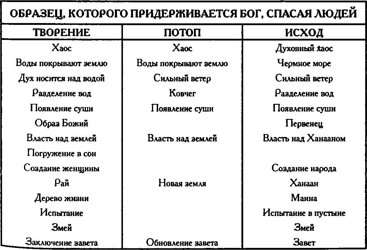 Теперь мы можем собрать воедино общую картину – тот образец, которого придерживается Бог, когда спасает людей. Обратившись к приведенной ниже таблице, мы отчетливо увидим взаимосвязь между тремя деяниями Бога: творением, потопом и исходом. Это еще одно для нас напоминание о Божьем постоянстве: когда Он действует, все Его деяния в полной мере соответствуют Его характеру и Его завету. Его прежние дела становятся образцом, или моделью, для всех последующих.