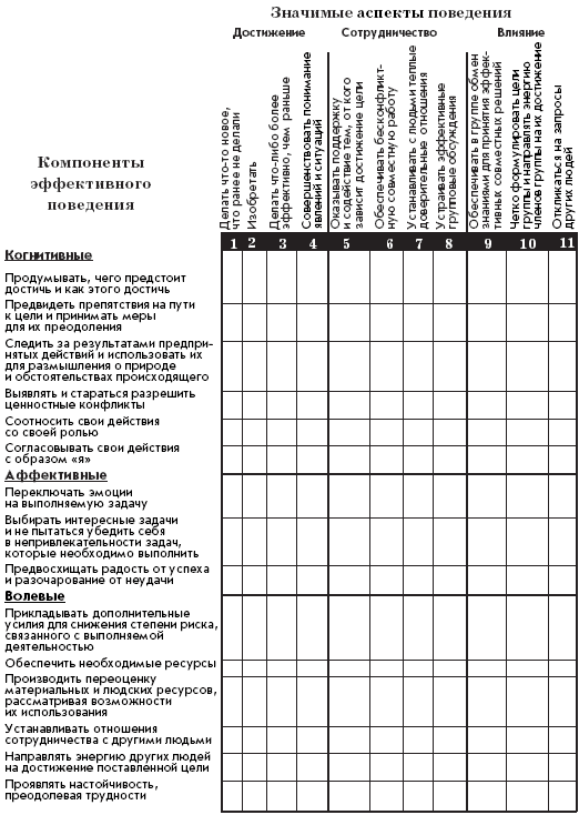 В верхней части таблицы перечислены некоторые значимые для человека типы поведения. Они объединены в три группы, выделенные Макклелландом в 1958 году и эмпирически подтвержденные в работах автора данной книги (Raven, 1972; 1977). Эти группы – «Достижение», «Сотрудничество» и «Влияние». По вертикали перечислены компоненты эффективного поведения, наличие которых делает весьма вероятным успешное завершение какой-либо деятельности. Эти компоненты компетентности включают когнитивные процессы (такие, как планирование или определение возможных препятствий на пути к достижению цели), аффективные процессы (использование эмоций – позитивных и негативных – для выполнения задачи) и привычное поведение (например, привычка к интенсивной работе). Перечислены также другие влияющие на достижение цели факторы, – такие, как поддержка окружающих и уверенность в том, что определенное поведение не противоречит ни собственным принципам человека, ни общему мнению о том, что следует делать в такой ситуации.