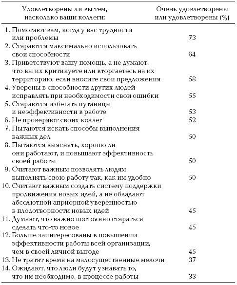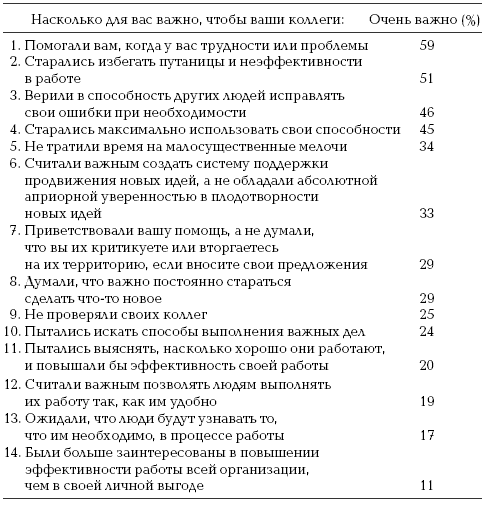 От коллег, как и от начальников, ожидают поддержки: половина респондентов считала, что коллеги должны уважать их зато, что они делают, две трети – что они должны решать проблему в сотрудничестве с коллегами, и половина – что коллеги должны быть признательны тому, кто занялся этой проблемой (см. таблицу 18).