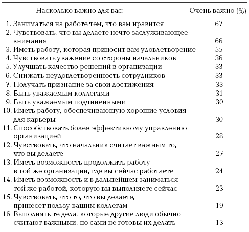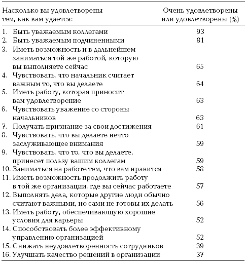 Эти данные могут дать основание и для нескольких более общих выводов. Бытовало мнение, что люди хотят иметь не столько интересную работу, сколько деньги и досуг. Приведенные здесь данные совершенно не подтверждают эту идею: большинство людей хочет выполнять приятную, удовлетворяющую, заслуживающую внимания работу, а досуг имеет намного меньшую важность. Однако из этих данных следует и то, что такая работа должна быть разнообразной и творческой и включать общение с коллегами в процессе достижения общей цели. Люди хотят самостоятельно принимать взвешенные решения, видеть результаты своей работы и принятых ими решений. Следовательно, существует настоятельная потребность в усовершенствовании систем обратной связи. Представленные здесь данные также предполагают, что разнообразная, удовлетворяющая работа, к которой стремятся люди, должна давать каждому человеку возможность проявлять свои многочисленные таланты и в то же время избегать ситуаций, которые ему неприятны. Необходимы также средства, обеспечивающие возможность совершенствоваться в профессиональной сфере и получать признание за свои достижения.