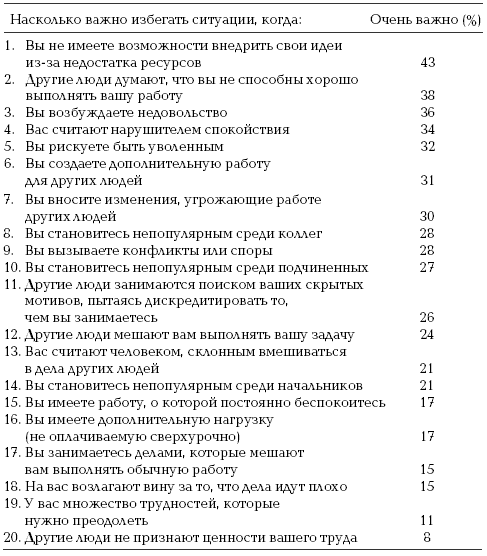 Приблизительно треть наших респондентов указывает, что важно избегать проявлений со стороны коллег недовольства по отношению к ним и роли нарушителя спокойствия, создания дополнительной работы для других, внесения изменений, угрожающих работе других людей, а также собственной непопулярности.