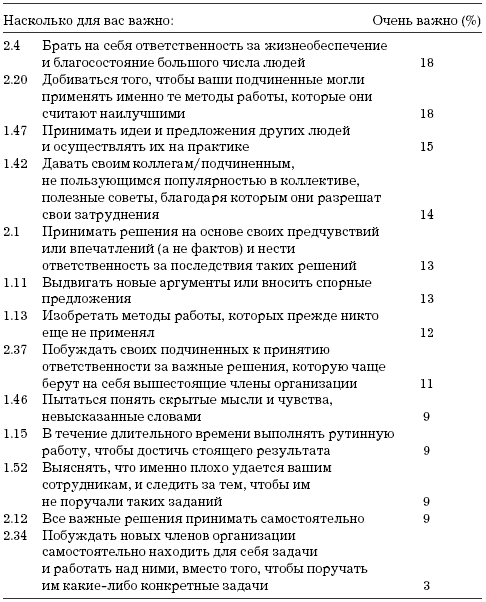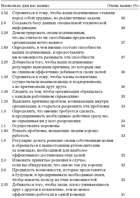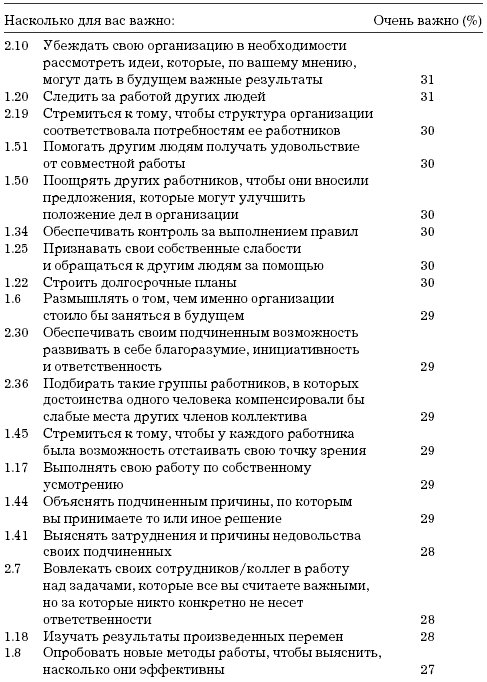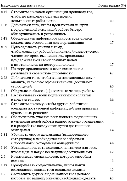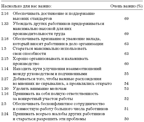 Первые по важности 15 пунктов позволяют предположить, что значительная доля наших респондентов разделяет традиционную точку зрения на сущность управления. Управление для них включает в себя следующие задачи: обеспечить достижение и поддержание высоких стандартов, убедить работников трудиться с максимально возможной для них производительностью труда, брать на себя ответственность за других, организовать и наладить эффективное производство, улучшать взаимоотношения между начальниками и подчиненными, добиваться того, чтобы работники сотрудничали друг с другом и максимально раскрывали свои способности; рассматривать и улаживать жалобы; добиваться того, чтобы каждый работник понимал, в чем заключается его задача.