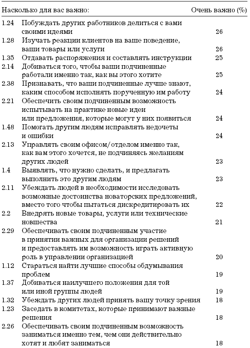 Лишь незначительное число респондентов стремится заниматься тем, что, казалось бы, является жизненно важным для эффективного управления организацией и для эффективного ее функционирования. Лишь немногие желают предпринимать какие-то действия, руководствуясь лишь своей интуицией, а также принимать предложения других людей, применять их на практике и заседать в комитетах, принимающих важные решения. Мало кто хочет развивать производство новых товаров и расширять сферу услуг, размышлять об их усовершенствовании и даже о том, как повысить эффективность производства товаров или оказания услуг. Лишь немногие стремятся к тому, чтобы убеждать других людей в необходимости внимательно исследовать поступающие предложения; разбираться с подтекстом того, о чем говорят другие люди; принимать на себя ответственность за жизнеобеспечение и благосостояние других людей; следить, чтобы люди занимались тем, что они любят и умеют делать, и чтобы их не просили делать то, что они не умеют; немногие, наконец, хотят вовлекать других работников в принятие важных решений.