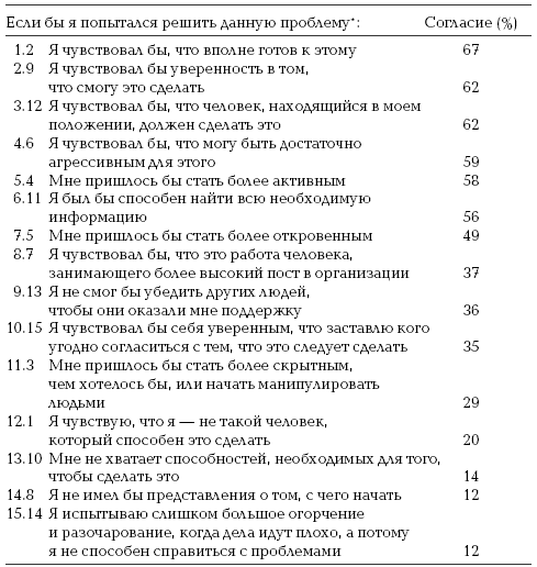 Однако несколько больше половины людей считали, что для успешного решения проблемы им пришлось бы стать более решительными и откровенными, чем им хотелось бы. Одна треть сообщает, что эту проблему должно решать более высокопоставленное лицо. Треть считает, что им не удастся убедить других людей оказать им поддержку и согласиться с тем, что нужно сделать.