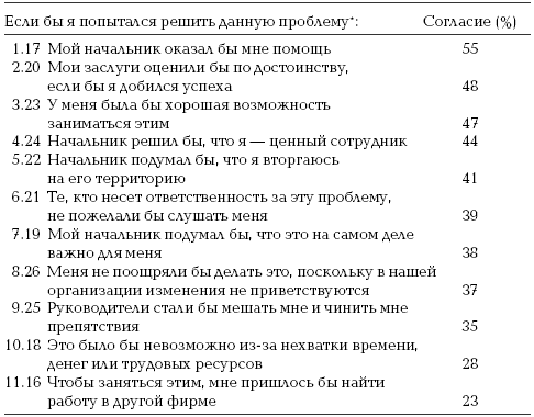 Вызывает удивление, насколько высоки были ожидания респондентов, что начальники могут оказать им поддержку в их попытках решить выявленные проблемы (см. таблицу 15). Лишь около трети из них считали, что начальник им не поможет, что он не пожелает внимательно их выслушать, станет чинить им препятствия, отговаривать их от решения этой проблемы или перестанет считать их ценными работниками.