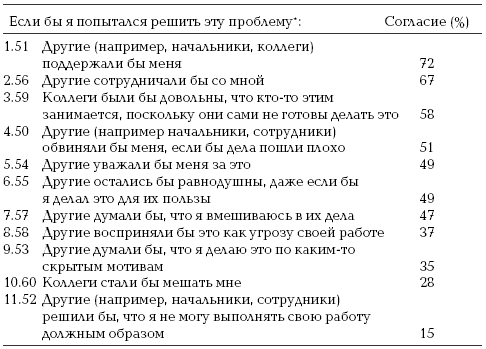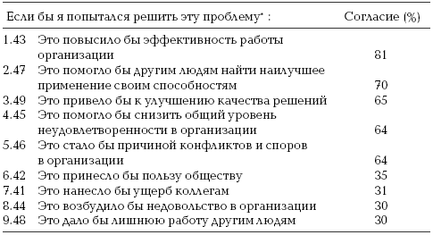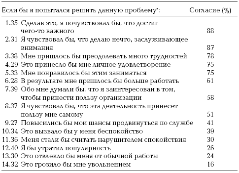 В своей работе мы сначала просили наших респондентов указать, насколько, по их мнению, вероятно, что их попытка решить проблему вообще повлечет за собой какие-либо общезначимые последствия. Затем мы просили их указать, как, по их мнению, на это отреагируют начальники. Далее мы просили их сообщить о возможных собственных реакциях: получат ли они от этого удовольствие? Сочтут ли они, что занимаются именно тем, что им следует делать? Наконец, мы просили их указать, какие виды компетентности они смогут проявить при решении проблемы, а также оценить свои возможности делать то, что, по их ощущениям, необходимо.