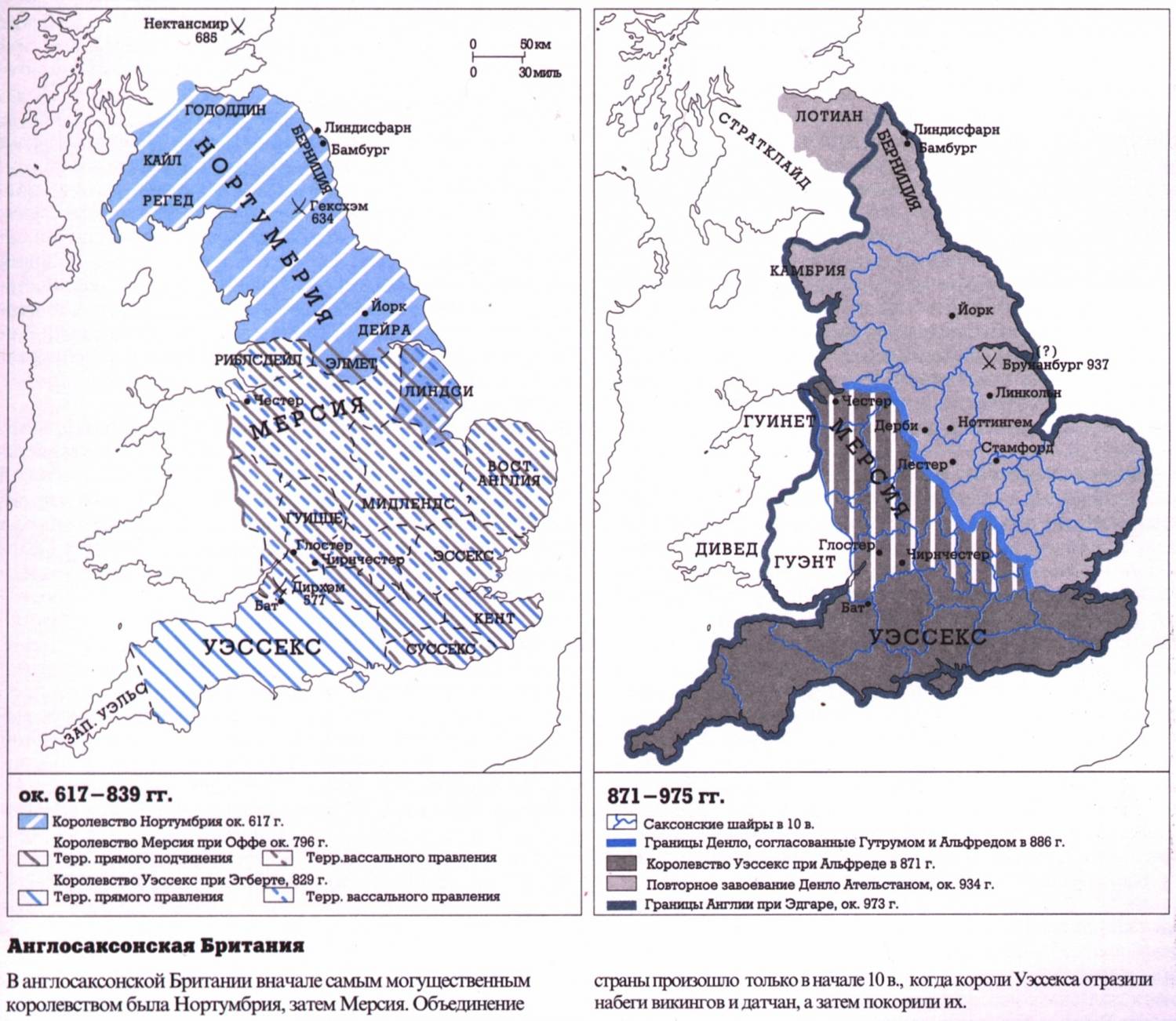 Все эти серьезные результаты были достигнуты не сразу: целый год прошел, прежде чем Этельберт сделался христианином, и хотя после его обращения жители Кента целыми тысячами заявляли о своем желании креститься, но прошли еще годы, пока Этельберт осмелился предложить сделать то же самое признававшим его верховенство королям Эссекса и Восточной Англии. Эти усилия Этельберта были и его последним делом, так как предшествовали революции, которая навеки сломила силу Кента. Племена Средней Британии восстали против его власти, которая перешла к правителю Восточной Англии Редволду. Эта революция свидетельствовала о произошедшей в Британии перемене. Вместо множества отдельных племен завоеватели организовались теперь в три больших группы. Королевство англов на севере простиралось от Гумбера до Форта, южное королевство вестсаксов тянулось от Уэтлингстрит до Ла-Манша, а между ними находилось королевство Средняя Британия, границы которого были неопределенны, но которое, тем не менее, составляло отдельное целое в период времени от царствования Этельберта до окончательного падения мерсийских королей. В течение двух следующих столетий история Англии заключалась в борьбе королевств Нортумбрийского, Мерсийского и Вестсаксонского за гегемонию надо всей остальной массой англичан и в стремлении создать из нее единый английский народ.