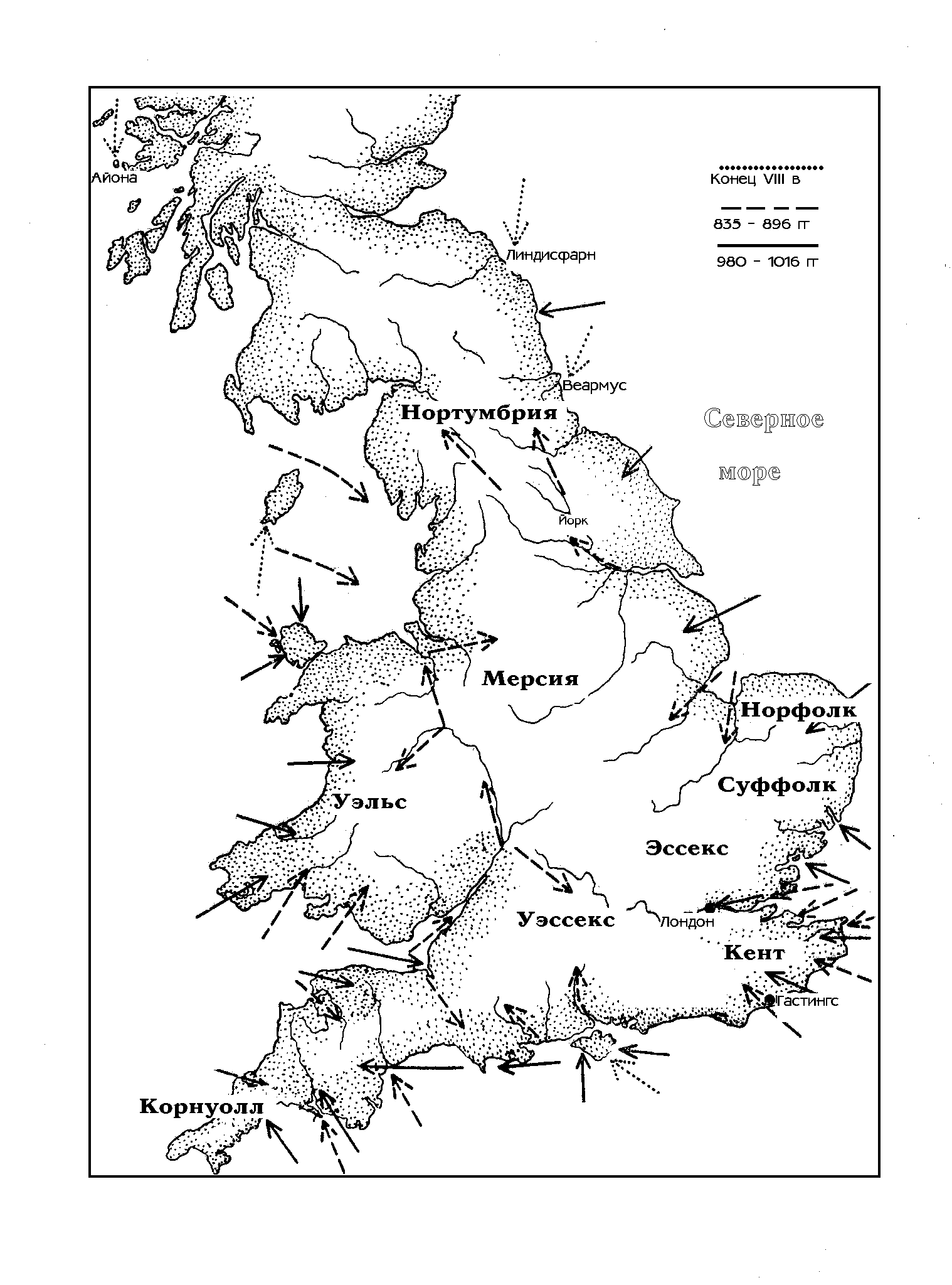 Едва началось национальное объединение, как кратковременное величие Уэссекса было низвергнуто датчанами. В продолжение всей той эпохи, когда в Британии происходили не только борьба, но и установление гражданского порядка, жители Скандинавии и островов Балтийского моря оставались совершенно чуждыми христианскому миру и боролись за существование лишь с суровым климатом, бесплодной почвой да морскими бурями. Набеги и морские грабежи пополняли их скудные средства для жизни, и вот, в конце VIII века, эти разбойники выступили за пределы тесной области побережья северных вод.