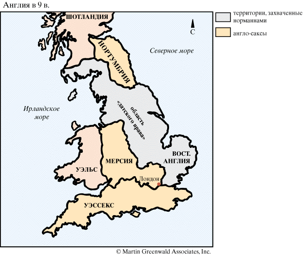 При виде неминуемой опасности соперники объединились, выступили против общего врага и оба пали мертвыми под стенами своей столицы. Нортумбрия подчинилась датчанам, и сама Мерсия спаслась только благодаря помощи короля Этельреда. Ноттингемский мир, которым Этельред в 868 году спас от гибели Мерсию, повлек за собой поход неприятеля к богатым аббатствам в Фен, и вслед за тем запылали Питерсборо, Кроуленд и Или; жившие в них монахи бежали или были перебиты на развалинах монастырей. Отсюда датчане бросились неожиданно на Восточную Англию, король которой Эдмунд, взятый ими в плен и приведенный к их предводителю, был привязан к дереву и расстрелян стрелами. Его мученическая кончина от рук язычников сделала его святым Себастьяном английской легенды. В позднейшие дни его фигура изображалась на разноцветных стеклах храмов на восточном берегу и над его могилой возвысилось величественное аббатство Сент-Эдмундсбери. Это был и последний восточноанглийский вице-король; его королевство было не только покорено, но через десять лет и разделено между датскими воинами, предводитель которых, Гутрум, надел на себя корону. Как велик был наведенный датчанами страх, видно из примера Мерсии, которая, не будучи еще покоренной, тем не менее преклонилась перед завоевателями и уплатой дани признала их в 870 году своими повелителями.