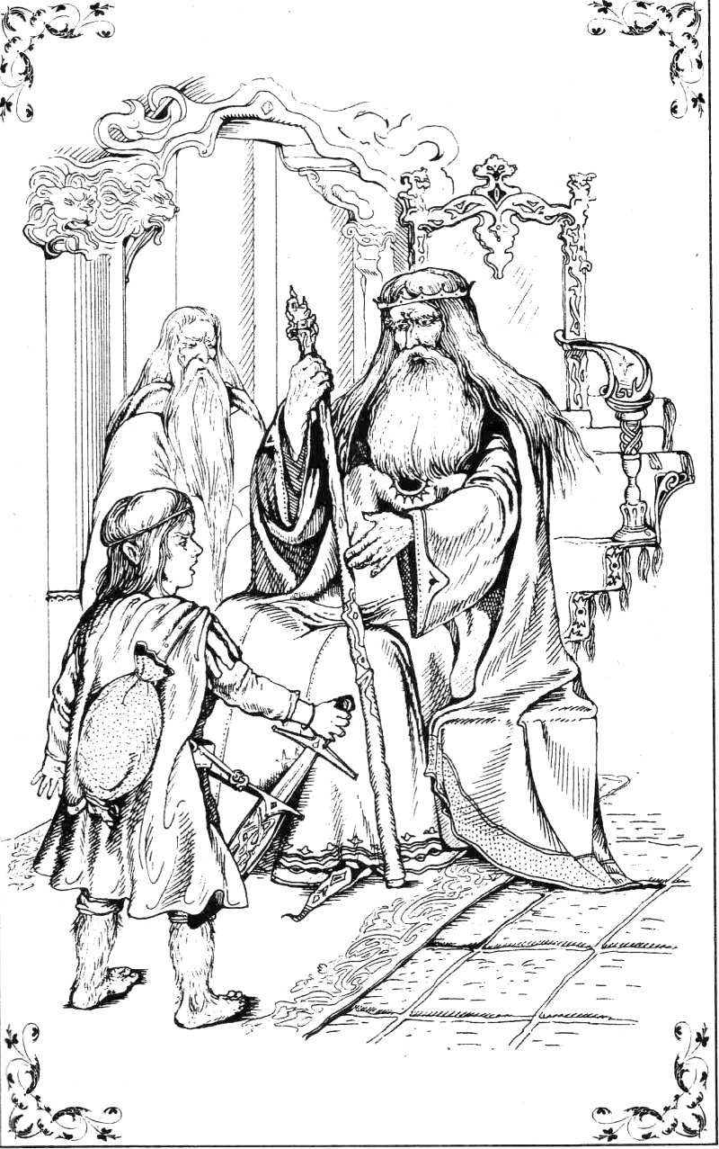 Пін пригадав кам'яних гігантів над Андуїном і мимоволі відчув повагу до давно померлих королів. У глибині зали, піднятий на декілька сходинок, стояв високий трон під мармуровим балдахіном. На стіні поза ним викладена з самоцвітів мозаїка зображала квітуче дерево. Трон був порожній. На широкій і високій нижній сходинці сидів у чорному мармуровому кріслі, стуливши повіки, сивий старий з білою позолоченою патерицею в руці. Він не міг не почути кроків, але не ворухнувся.