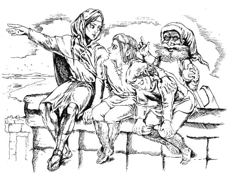 Ельф і гном поруч увійшли на вулиці Мінас-Тіріту, і перехожі кидали здивовані погляди на незвичайну пару. їх вражала краса ельфа і його поводження: він легко йшов по крутій дорозі, наспівуючи, не мружачись від ранкового сонця. Гімлі крокував статечно, погладжуючи бороду і діловито поглядаючи на всі боки.