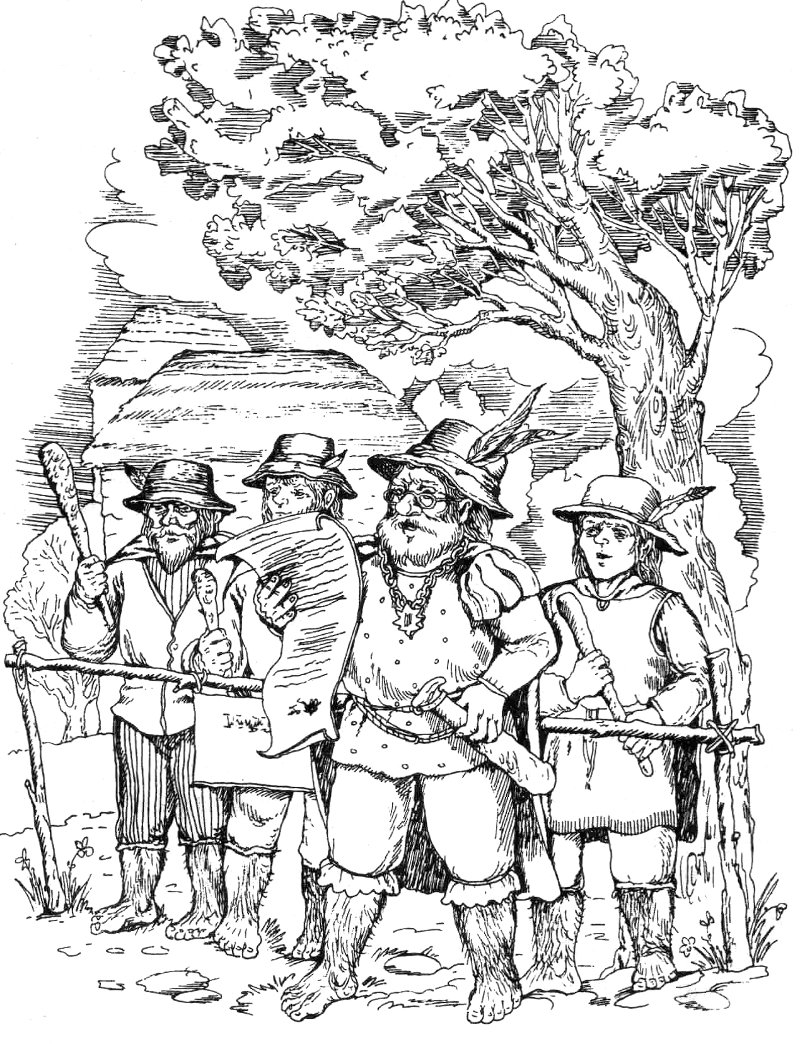 За рогаткою стовпилися гобіти з пір'ям на шапках і з ціпками в руках, фізіономії їхні були пихаті, надуті і трохи злякані.