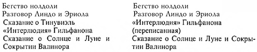 На первый взгляд, мы сталкиваемся со свидетельствами, безнадежно противоречащими друг другу: Связующее Звено явственно отсылает к Затмению Валинора, сказанию, написанному после того, как отец получил должность в Оксфорде в конце 1918 года, но одновременно это вступление к Сказанию о Тинувиэль, которое, по его словам, было написано в 1917 году. Но Сказание о Тинувиэль (и предшествующее ему Связующее Звено) – это текст, написанный чернилами по стертому оригиналу в карандаше. Я полагаю несомненным тот факт, что это сказание было переписано чернилами довольно поздно. Оно было присоединено к Бегству Нолдоли разговором Линдо и Эриола (абзац-связка неотъемлемо соединен со следующим за ним Сказанием о Тинувиэль, а не был добавлен позднее). Должно быть, на этой стадии отец почувствовал, что Сказания не обязательно должны идти по порядку (потому что действие Сказания о Тинувиэль происходит, конечно, после создания Солнца и Луны).