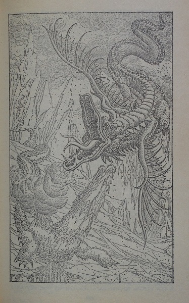 Между тем, в пещере обитал громадный дракон весьма неприветливого нрава. Представьте себе ужас беглеца, когда его пробудили от сна огненное дыхание и обвившиеся вокруг него чешуйчатые кольца!