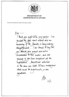 (Тем временем Бернарда Вули все больше мучили угрызения совести: ему было неловко скрывать факты от своего министра. Он никак не мог приучить себя к мысли, что фраза «есть вещи, которых министру лучше не знать» является основной гарантией для безопасности государственной службы. Кончилось тем, что он направил сэру Хамфри записку с просьбой объяснить, почему господину министру не следует знать то, что он хочет знать. Ниже приводится ответ сэра Хамфри. – Ред.)