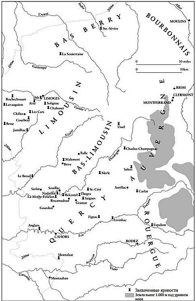 После падения английского господства в Керси эта провинция оставалась главным центром операций Бертуки в течение следующих четырех лет. В 1371 году общая численность его компании и компании Бернара де Ла Салля составляла около 160 человек пехоты и около 500 конных пехотинцев – весьма значительные силы по меркам армий XIV века. Известно, что в этот период под их контролем находилось по меньшей мере одиннадцать гарнизонов в Керси, а также важный город Эспальон с мостом через реку Ло в западной части Руэрга. Этот список, конечно, неполный. По мере постепенного отступления англичан из восточных провинций Аквитании рутьеры расширяли диапазон и масштаб своих операций, чтобы заполнить образовавшуюся пустоту. Свободная федерация гасконских компаний заняла крепости, расположенные по широкой дуге, простирающейся от Тарна на юге до Вьенны на севере. Их методы были классическими методами иррегулярных солдат на протяжении всей Столетней войны. Они разведывали оборону замков и небольших городов, подкупали защитников или внедряли в город своих людей в базарные дни, замаскированными под купцов или крестьян. Они перелезали через неохраняемые участки стен по приставным лестницам в темное время суток или пробирались через ворота, открытые для них изнутри. Они размещали небольшие группы людей в хорошо укрепленных замках на небольшом расстоянии друг от друга. Их гарнизоны имели своих капитанов и действовали более или менее автономно. Но они действовали сообща, разделив регион на районы, которые они делили между собой, и объединяя силы для дальних набегов или для отражения атак армий лейтенантов короля. Они душили торговлю больших торговых городов, охотясь на купцов, требуя выкупы за путешественников и похищали горожан, работавших на виноградниках и огородах у стен. Затем, когда условия становились трудными, они продавали занятые замки, забирали свою прибыль и вновь обосновывались в других местах[237]237