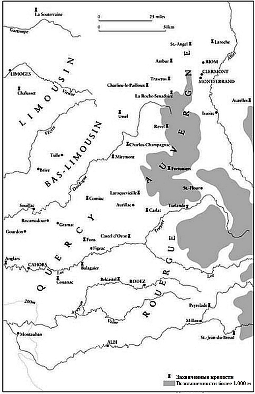 Главным результатом такого невнимания к Гаскони стала новая глава в деятельности гасконских вольных компаний. Когда Джон Гонт прибыл в Аквитанию в декабре 1373 года, регион был недавно умиротворен соглашениями, которые граф Арманьяк и Папа заключили с двумя главными капитанами, Бертукой д'Альбре и Бернаром де Ла Саллем. Они оставили за собой право сражаться в составе любой армией, возглавляемой королем Англии или одним из его сыновей. Поэтому прибытие Джона Гонта фактически освободило их от обязательств. Бернар де Ла Салль покинул Средиземноморье и вернулся на гасконскую границу. К началу декабря 1373 года его компания и остатки компании Бертуки соединились с английской армией в Лимузене. Сам он находился вместе с Джоном Гонтом в Бриве. Гонт проводил целенаправленную политику, пытаясь удержать области, лежащие к востоку от сократившихся границ герцогства, с помощью таких гасконских компаний, как его. Он назначил Бернара капитаном короля Англии в Лимузене и, похоже, дал ему общее поручение действовать от имени Эдуарда III в соседних провинциях центральной Франции. В середине декабря 1373 года Бернар, взяв свою компанию и несколько отрядов английской армии, отправился на юг в Канталь, регион горных долин и густых лесов, испещренный древними крепостями, где западные предгорья гор Оверни постепенно снижались и переходили в мрачные кюссы Керси. Здесь он занял ряд опорных пунктов, которые стали главным центром деятельности рутьеров на юге Франции почти на двадцать лет[303]303