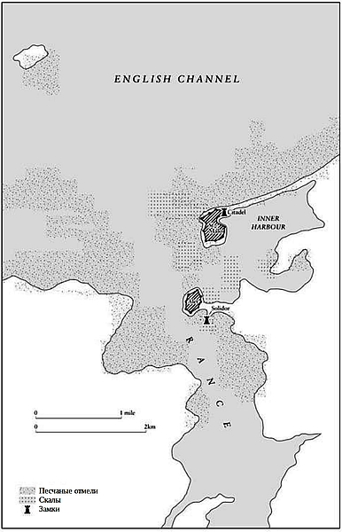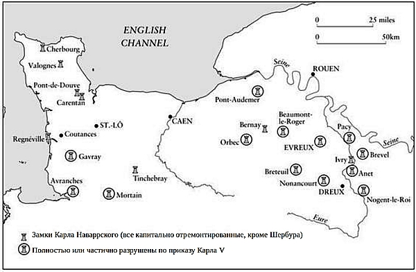 Шербур был большим призом. Стены города были в значительной степени перестроены в 1360-х годах. Огромный клинообразный замок главенствовал над гаванью с восточной стороны города. Он имел двенадцать башен, высокие стены и глубокие рвы, и все это всего в семидесяти милях по морю от Англии. Это была одна из самых сильных крепостей на западе Франции. Сеньор Гарро, по-видимому, согласился с английскими предложениями, но он не мог ничего подписывать без полномочий от Карла Наваррского. Примерно в середине апреля, пока офицеры герцога Бургундского вели переговоры о сдаче Эврё, Бретея и Берне, сеньор Гарро отправился из Англии в Наварру на быстроходном вооруженном судне из Байонны[453]453