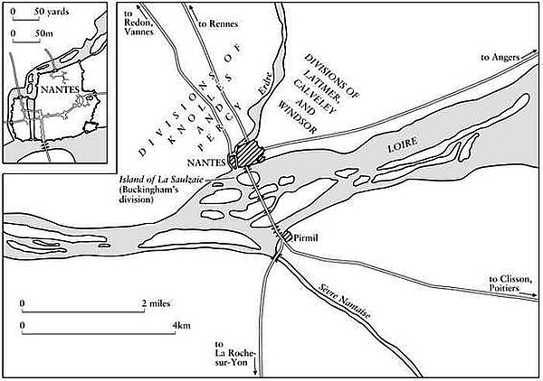 Нант был богатым городом, хорошо живущим за счет торговли вином и солью, который сравнительно мало пострадал от войны. Осаждать его было трудной задачей. У города были мощный стены полного обвода и он был относительно компактным, не более тысячи ярдов в окружности, что означало, что его мог оборонять небольшой гарнизон при поддержке горожан. Город и равнину к северу от стен разделяла река Эрдр. Луара, в то время имевшая более мили в ширину, была разделена на рукава с быстрым течением, протекавшими между рядом больших островов. Граф Бекингем был вынужден разделить свою армию вокруг Нанта на три более или менее независимые части. Латимер, Калвли и сэр Уильям Виндзор расположились лагерем на восточной стороне города. Ноллис и Перси находились на западе за рекой Эрдр. Сам граф занял Ла Солзе, обитаемый остров на Луаре прямо напротив речных ворот города. Ни один из этих отрядов английской армии не был в состоянии быстро оказать помощь другому в случае нападения, и даже имея 5.000 человек англичане не смогли блокировать весь город. В самом начале осады граф направил в Англию спешный призыв о подкреплении. Он заявил, что ему срочно требуется еще как минимум 2.000 человек. Пока Совет пытался их предоставить, его действия зависели от обещаний герцога Бретани. Но Иоанна IV нигде не было видно. Граф отправил ему целый поток посланий, ни на одно из которых не было получено ответа. В Париже новый коронованный король вступил в столицу 11 ноября, приветствуемый восторженными толпами и бесчисленными просителями, ожидавшими возобновления обычных государственных дел. Среди просителей были послы герцога Бретани. Сразу после окончания празднеств они заключили бессрочное перемирие с французским королевским Советом. 19 ноября 1380 года Иоанн IV назначил четырех видных дворян, все из которых были связаны с Бретонской Лигой предыдущего года, для проведения переговоров с регентом, в обстановке строжайшей секретности, о постоянном урегулировании[569]569