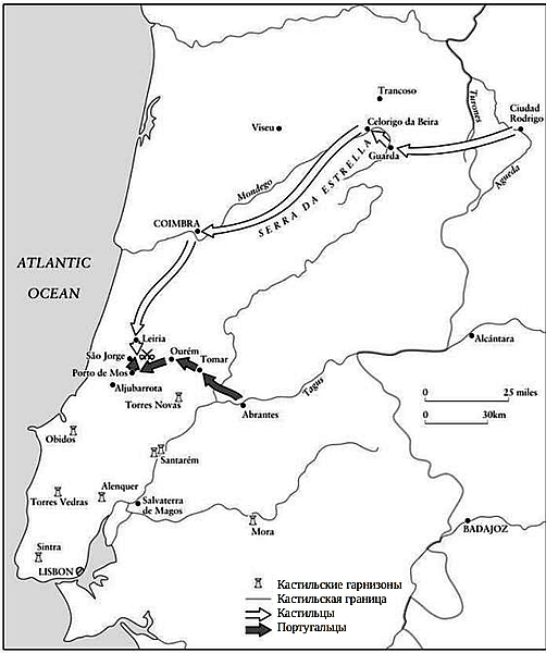 В конце июля 1385 года Жуан Ависский объединил силы со своим коннетаблем, Нуну Альварешем Перейра, у моста Абрантес на реке Тежу. Там состоялся военный Совет, который в некотором роде повторял заседания Совета Хуан I в Сьюдад-Родриго. Большинство советников португальского короля, как и советников его соперника, были против того, чтобы рисковать в битве. Они предпочитали дождаться прибытия подкреплений из Англии, которые, как сообщалось, были уже на подходе. Главным сторонником наступательных действий был коннетабль, Нуну Альвареш. Он указал на то, что большая часть гарнизона Жуана Ависского в Лиссабоне была выведена, чтобы увеличить численность его армии. Если не остановить кастильского короля, он объединит свои силы с гарнизонами кастильцев вокруг Лиссабона и тогда ничто не помешает ему взять столицу штурмом. Изложив свои соображения перед скептически настроенным Советом, коннетабль вышел. Он объявил, что поведет своих людей против врага, что бы ни решили остальные. Жуан Ависский отверг предложение своих советников и принял совет Нуну Альвареша. И похоже, что у него не было выбора. Он не мог позволить себе избежать сражения, как и его кастильский соперник, если хотел сохранить свою поддержку в Португалии. Итак, на второй неделе августа 1385 года португальская армия двинулась на восток к Порту-ди-Мош, замку, стоящему на возвышенности над рекой Лена, чуть восточнее главной дороги из Коимбры в Лиссабон. Было известно, что кастильская армия расположилась лагерем к северу вокруг города-крепости Лейрия, который когда-то служил южным бастионом христианского королевства в борьбе с маврами[787]787