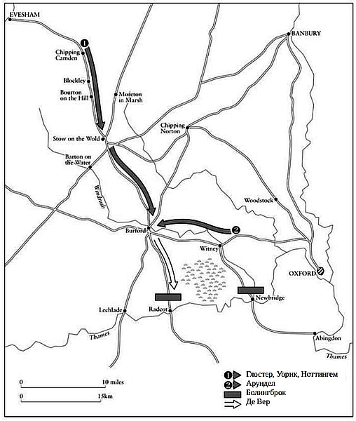 Армия де Вера, около 4.000 человек из северо-западной Англии и северного Уэльса, собралась в Флинте и Пулфорде в первую неделю декабря 1387 года. Через несколько дней она двинулась на юг через Шрусбери, Вустер и Ившем. Судя по всему, армия лордов-апеллянтов значительно превосходила армию де Вера, особенно в численности латников. Ее ядро составляли военные дружины пяти лидеров мятежа, людей, объединенных в основном узами личной преданности своим вождям. Но присутствие в армии лордов-апеллянтов людей из разных регионов Англии, говорит о широкой поддержке их дела, выходящей далеко за пределы территориальных интересов их лидеров, "крепкие сердца со всех концов земли", как выразился дружественный лордам-апеллянтам хронист. В середине декабря армия лордов-апеллянтов двинулась на запад из Хантингдона. Их целью было остановить де Вера в средней Англии и предотвратить объединение его с королем. Де Вер должен был избегать сражения и сохранить свои силы для решающего столкновения под Лондоном. Однако 19 декабря 1387 года он обнаружил, что за Ившемом дорогу ему заблокировали. Лорды-апеллянты разделили свои силы и заняли все основные дороги и переправы через реки в западном Котсуолде. Де Вер решил повернуть на юг и идти к переправам через Темзу. Под покровом густого осеннего тумана он прибыл к каменному мосту через Темзу в Рэдкоте, но обнаружил, что его удерживает Болингброк. Зажатый между армией Болингброка впереди и Глостером и Арунделом сзади, де Вер попытался пробиться через мост, но его армия была быстро разгромлена. Многие из его людей утонули в болотах Темзы, пытаясь спастись. Остальные сдались. У них отобрали оружие и отпустили. Сам де Вер переплыл реку на лошади и исчез в ночи[894]894
