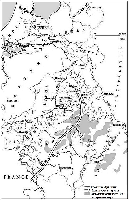 Если кто-то и сомневался в этом, то глаза его открылись во время похода обратно во Францию. Французам не удалось пройти по римской дороге, которая шла вдоль западного берега Меза, потому что люди из Маастрихта и Льежа охраняли мосты и отказывались пропускать их. В Люксембурге они были встречены с ненавистью. В сельской местности были уничтожены все продукты питания, а города закрыли свои ворота. Отряды герцога Гельдерна, видя беспорядок в рядах французов и чуя возможность поживиться, преследовали отступающие войска на каждом шагу. Мосты охраняли от захватчиков большие отряды пехоты. Реки вышли из берегов после шести недель непрерывных дождей. Броды были непроходимы. Люди и лошади тонули, пытаясь пробраться через бурные потоки воды. Телеги теряли колеса и оси в рытвинах. Охромевших лошадей пришлось бросить. К концу октября потрепанная и голодная армия достигла французской границы, выглядя как потерпевшая поражение[924]924