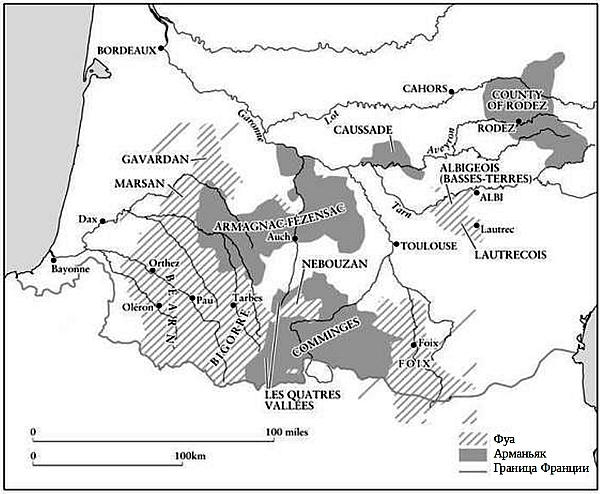 Главными из местных магнатов были графы Арманьяк и Фуа. В течение многих лет затянувшаяся распря между этими двумя могущественными южными семьями была одним из основных источников политической нестабильности в регионе. Гастон III, граф Фуа (известный как Гастон Феб), был тонким политиком, который унаследовал свои владения в возрасте двенадцати лет в 1343 году и самостоятельно управлял ими с пятнадцати лет. Он был противоречивым человеком: трезвомыслящий правитель, диктующий одновременно письма четырем секретарям; утонченный государь, содержащий один из самых известных малых дворов Европы; одержимый скупец, хранящий сокровища в замке Ортез; решительный человек действия, собирающий прекрасные книги и написавший на изысканном французском языке молитвенник и трактат о охоте с ястребом; осторожный политик, подверженный внезапным вспышкам неконтролируемого гнева. Все это были разные стороны одной и той же загадочной личности. Гастон Феб потратил целую жизнь на создание крупного автономного княжества только для того, чтобы собственными руками убить сына, который должен был его унаследовать. Владения Гастона состояли из трех отдельных территории в Пиренеях: виконтства Беарн и прилегающих районов южной Гаскони на западе; небольшого виконства Небузан вокруг Сен-Годенс на востоке; и графства Фуа в верховьях реки Арьеж к югу от Тулузы. В дополнение к ним он унаследовал от своей матери значительный участок территории между долинами рек Тарн и Агу, к северо-востоку от Тулузы, включая большую часть южного Альбижуа. Большинство владений Гастона Феба располагались в горах и были бедны. Но в них проживало большое количество выносливых горцев для пополнения армий графа. Доходы от владений Гастона были невелики, но он разбогател на добыче захваченной во время своих войн и покровительстве вольных компаний. Граф быстрее, чем большинство французских дворян того времени, понял, что деньги стали более надежным капиталовложением, чем земля. Накопленные им сундуки с деньгами позволили ему заняться выгодной торговлей военнопленными и ссужать деньги под проценты нуждающимся принцам и капитанам, а также использовать свои собственные политические возможности, когда они появлялись[944]944