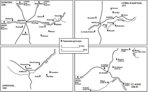 Случайно или намеренно возвращение Бертуки д'Альбре из Англии ознаменовало начало нового всплеска активности рутьеров по всей южной Франции. Самой большой концентрацией компаний рутьеров оставались десять-пятнадцать гарнизонов, связанных с Карла, которые всегда обращались за руководством к Бертуке д'Альбре. Они действовали вместе как единая объединенная компания и осуществляли почти полный контроль над обширной территорией в Оверни и Кантале, простиравшейся на юг до Руэрга и Жеводана и на восток до Веле. С ними были тесно связаны гарнизоны по крайней мере восьми замков в соседней провинции Керси, которые были заняты собственными отрядами Бертуки и которыми командовали два его лейтенанта: Ноли Барбе, капитан из Пинсака на Дордони, и Бернар Дуа, чья главная база находилась в Монвалане на небольшом расстоянии вверх по реке. К северу от обширной территории, занятой конфедерацией Карла, существовали две различные группы гарнизонов рутьеров, действовавших из Нижнего Лимузена, которые сотрудничали с капитаном Карла, когда им это было выгодно. Одна группа контролировалась Перро де Беарном и Мериго Марше, которые обычно действовали в тесном сотрудничестве; другая – бретонцами Жоффруа Тет-Нуара в Вентадуре. Эти капитаны контролировали около сорока крупных гарнизонов на западных склонах Центрального массива в дополнение к большому количеству мелких крепостей, укрепленных церквей и фермерских домов, которые служили местными складами и центрами сбора. В провинциях, граничащих с Гасконью, в Ажене, Перигоре, Ангумуа и Сентонже, действовало примерно пятьдесят или шестьдесят гарнизонов[966]966