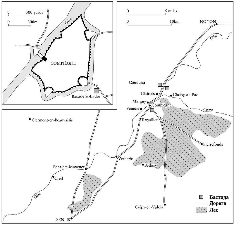 В 1430 г. обороной Компьеня руководил капитан города, пикардийский оруженосец Гийом де Флави. Это был человек сильной воли, безграничной энергии и горячего нрава, участвовавший в самых смелых военных авантюрах того времени. Он отказался от богатой невесты и крупной взятки, которую предлагал ему герцог Бургундский за сдачу города. Но отстоять его было непросто. В начале года в Компьене было размещено большое количество войск, но все они были выведены до начала осады. Компьень пришлось защищать силами горожан и нанятого муниципалитетом за свой счет отряда из 600 профессиональных солдат. Граф Клермонский, занимавший в этом регионе главенствующее место среди французских военачальников, находился вместе с королем в долине Луары. В его отсутствие командование сектором принял на себя граф Вандомский. Он разместил свой штаб в Санлисе, в двадцати двух милях от города. Там к нему присоединились некоторые отряды, покинувшие осажденный город. Кроме того, под его контролем были важные французские гарнизоны в Крее и Крепи-ан-Валуа[473]473