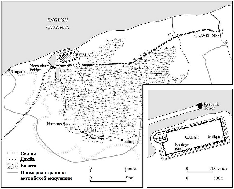 Кале был неприступен, как ни одна крепость в Европе. Город представлял собой прямоугольник длиной около 5.000 футов и шириной 1.700 футов, обнесенный стенами из известняка. В его северо-западном углу, у устья реки Ам, возвышался мощный замок, отделенный от города и окрестностей собственным рвом. С приморской стороны город и замок защищал заполненный водой ров и длинная песчаная коса, окружавшая гавань, на конце которой, находился форт, известный как башня Рисбанк. Со стороны суши стены были защищены двойной линией широких рвов, заполненных морской водой которую невозможно было отвести. Постоянный гарнизон составлял от 500 до 2.000 человек, а гражданское население – около 3.000 человек, почти полностью состоявшее из англичан. Подступы к городу охранялись кольцом из шести вспомогательных фортов, которые отодвигали границу английской оккупации на десять миль в глубь страны и окружали территорию площадью около 120 кв. миль. Гин, самый важный из этих пунктов и единственный значительный населенный пункт, помимо самого Кале, представлял собой обнесенный стеной город на южной оконечности зоны оккупации, над которым возвышался большой замок, стоявший над дорогой из Сент-Омера. К нему примыкали пять небольших фортов – Уа, Марк, Баленгем, Ам и Сангатт. Кале обладал как мощной искусственной, так и естественной защитой. От скал Эскаллес на западе до реки Аа на востоке простиралось обширное болото. Из-за вязкого грунта было очень мало мест, где осаждающие могли бы установить артиллерию. Вдоль берега тянулась линия дамб, сдерживавших натиск моря. Шлюзовые ворота у мостов Уа и Ньюэнхем позволяли в считанные часы затопить всю равнину морской водой. Отделенный всего двадцатью милями моря от побережья Кента и связанный с соседними фортами густой сетью водных путей, Кале было сравнительно легко снабжать подкреплениями и продовольствием, а также невозможно взять измором, не имея большого флота для блокады города с моря. Это было непросто даже для крупной морской державы. Ла-Манш часто штормит, и кораблям трудно оставаться у берегов. Филипп Добрый наверняка представлял себе, на что он идет, осаждая Кале. Он заказал художникам планы оборонительных сооружений и, вероятно, тщательно изучил их, что является одним из самых ранних зафиксированных примеров использования военной картографии в Европе[696]696