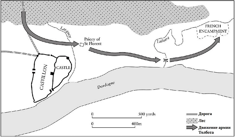14 июля 1453 г. французы начали две крупные осады в один день. Граф Клермонский и три южных феодала взяли замок Кастельно-де-Медок, расположенный в двадцати милях к северу от Бордо. На противоположном конце театра военных действий французские маршалы осадили Кастильон. Толбот решил атаковать армию маршалов под Кастильоном, хотя она находилась дальше и была значительно больше армии графа Клермонского. Возможно, его расчеты были ошибочны. Но для него было бы характерно атаковать более многочисленную армию, поражение которой имело бы большее влияние на ход кампании. Это решение вызвало резкий протест со стороны жителей Бордо, но Толбот остался непоколебим. Командовать в городе остался сенешаль сэр Роджер Камойс с 1.650 английскими солдатами. Остальные составили ядро полевой армии Толбота. Численность армии он восполнил за счет привлечения гасконских союзников и переброски войск из других городов и замков, находившихся под его контролем. Утром 16 июля Толбот вышел из Бордо и направился к Кастильону. По французским оценкам, которые в целом совпадают с английскими, численность войск Толбота составляла 6.000 ― 7.000 человек, то есть примерно столько же, сколько и армия французских маршалов. По меньшей мере 1.500 из них были гасконцами, сражавшимися под командованием двух его главных гасконских союзников Пьера де Монферрана и Жана де Грайи. Остальные были англичанами[1023]1023