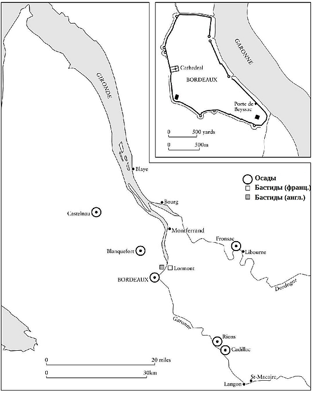 Обороной города руководил сэр Роджер Камойс. Как только он получил известие о падении Кастильона, он заставил Совет заседавший в замке Омбриер созвать представителей Штатов Гиени. Штаты, которые к этому времени представляли только сам Бордо, собрались в городском соборе. Они выдвинули Камойса в качестве своего губернатора и поклялись, что скорее умрут, чем подчинятся короне Франции. Камойс пессимистично оценивал свои шансы и не скрывал этого. Бордо был хорошо укрепленным городом. Периметр его стен XIV века составляла четыре мили. Город имел прямой выход к реке, ширина которой в тот момент составляла почти 700 ярдов. Все это затрудняло его блокаду. Но, как отмечал Камойс, французы имели подавляющее превосходство в людях и вооружении. Английские солдаты, находившиеся в городе, не желали рисковать своими жизнями без жалованья, а казна Совета была пуста. В ответ на это Штаты ввели в городе талью. Более двух десятков видных горожан во главе с архиепископом заключили личные договоры, чтобы обеспечить выплату жалованья английской армии на время ее сбора. После того как солдаты бежавшие с поля боя и из периферийных гарнизонов вернулись в Бордо, под командованием Камойса оказалось более 3.200 человек. Кроме того, на Гаронне оставались еще два важных гарнизона. Рион, расположенный в двадцати милях выше по течению от Бордо, защищали 130 английских солдат, а Кадильяк, находящийся в трех милях дальше – 460. Эти места были крайне важны для обороны Бордо, поскольку препятствовали поставкам припасов и артиллерии французам. Кадильяк был осажден графом де Фуа, но его с ожесточением защищал гасконский капитан. Ниже по течению от Бордо той же стратегической цели служил замок Бланкфор, где гасконский гарнизон Гайяра де Дюрфора все еще держался против армии графа Клермонского. Тем временем из Бордо в Англию отправлялись гонцы с сообщениями об опасности, в которой оказался Бордо, и с настоятельными просьбами о подкреплении[1026]1026