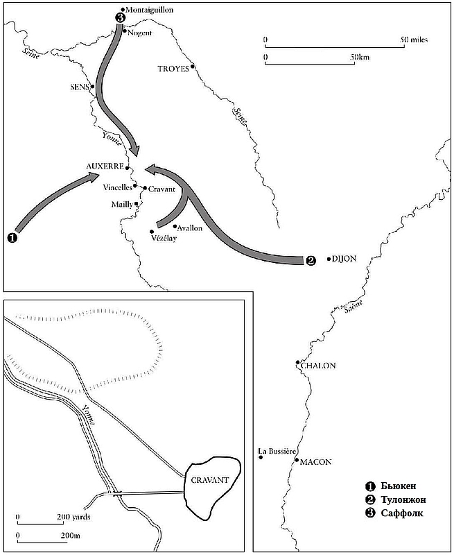 17 июля 1423 г. графы Солсбери и Саффолк двинулись на юг из под Монтегийона, оставив заслон из войск для сдерживания гарнизона Прежена де Коэтиви. До Осера оставалось около 60-и миль, и они добрались до него только 30 июля. Там их уже ждала бургундская армия Жана де Тулонжона. Вечером капитаны собрались в соборе, чтобы составить план кампании. У них было около 1.500 латников, примерно поровну разделенных между англичанами и бургундцами. Если исходить из того, что подавляющее большинство лучников были англичанами, то общая численность войск составляла около 3.000 англичан и от 1.000 до 2.000 бургундцев. Также имелись три небольшие пушки (veuglaires), установленные на деревянных колесных лафетах, которые были привезены из арсенала в Дижоне. Для того чтобы две армии с совершенно разными традициями оставались "едины в дружбе и союзе", был составлен свод военных указов, носящий явный отпечаток английской редакции. На рассвете следующего утра в соборе была отслужена месса для всей армии. Под звуки труб на улицах были зачитаны военные указы. Затем объединенная армия двинулась на юг, вверх по правому берегу Йонны, по которой за войсками следовала флотилия барж с артиллерией и пешими солдатами[126]126
